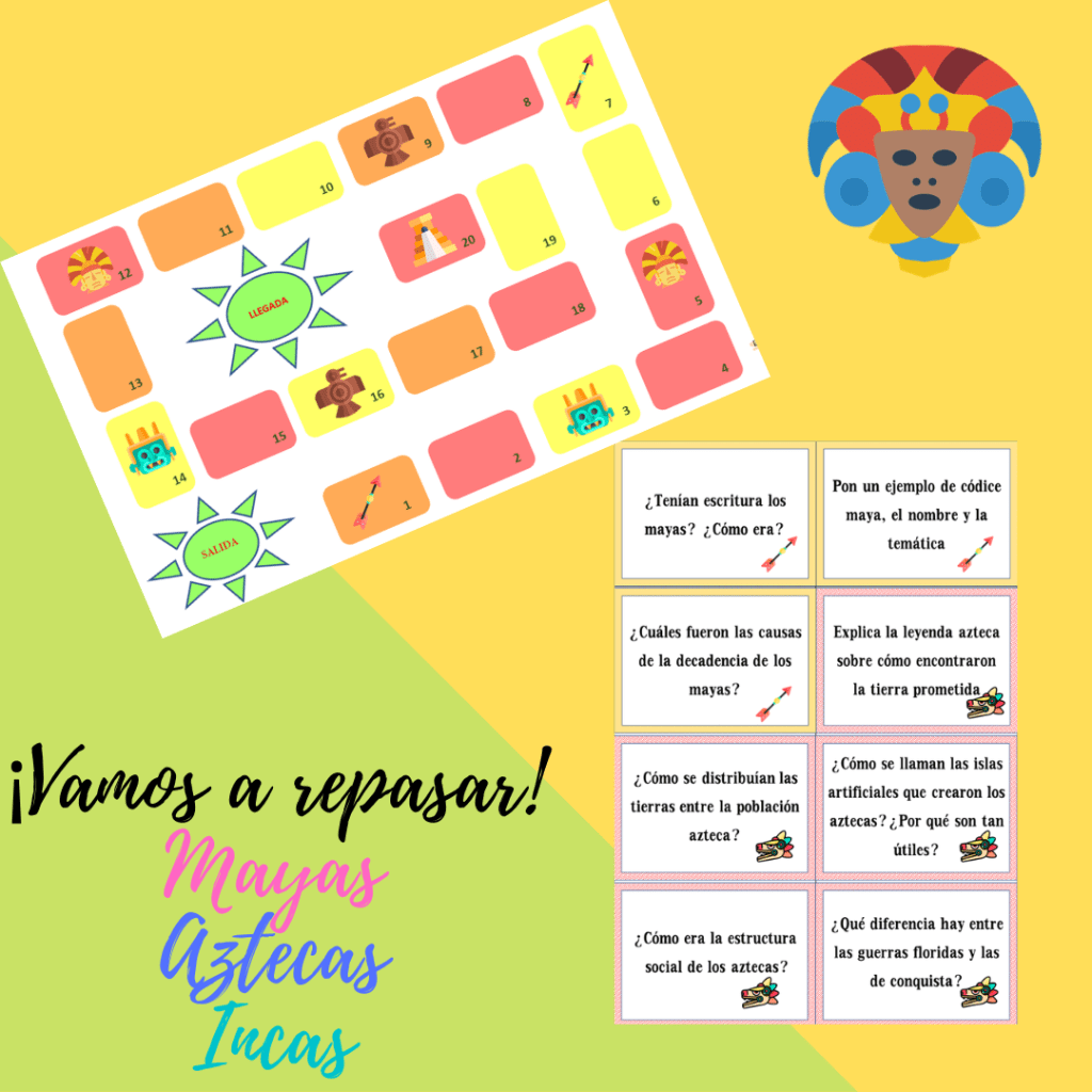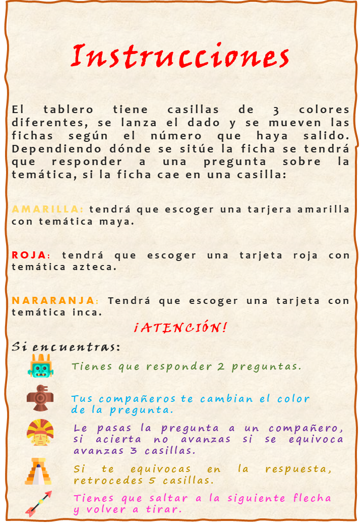 Os comparto un juego que estoy realizando con mis estudiantes chinos, de cuarto de carrera, para repasar las sociedades precolombinas. Las preguntas están inspiradas en el libro teórico que estamos trabajando en clase, titulado Panorama histórico-cultural de América Latina de la editorial Shanghai foreign language education press. Os adjunto: Las instrucciones, el tablero, las fichas y las tarjetas.