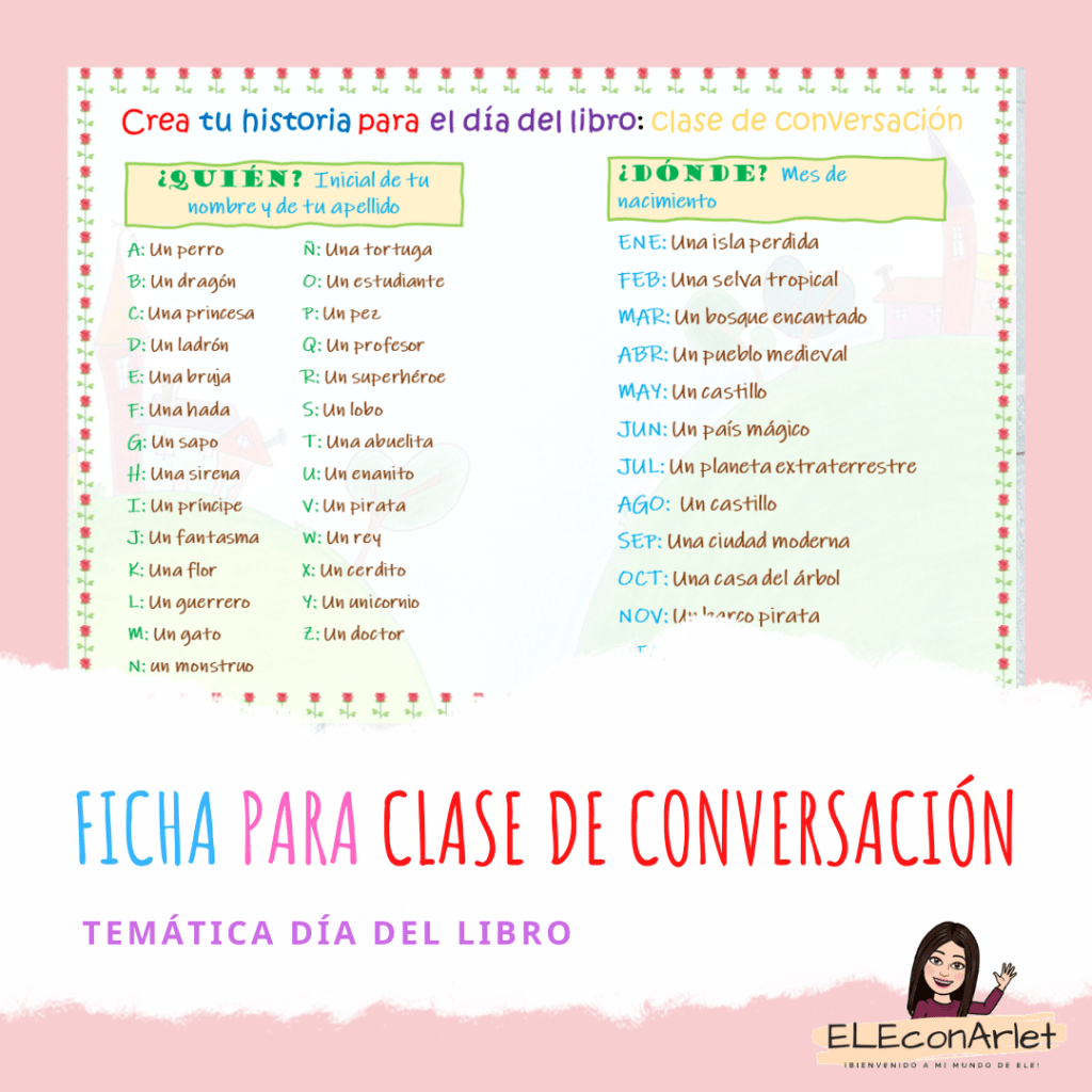 Esta actividad consiste en que el estudiante haga una historia, los dos personajes son aquellos que han salido como resultado de la inicial de su nombre y de su apellido. El lugar en el que se va a desarrollar la acción se decide según el mes de nacimiento. Es una actividad que sirve tanto para la comunicación oral como para la escrita.