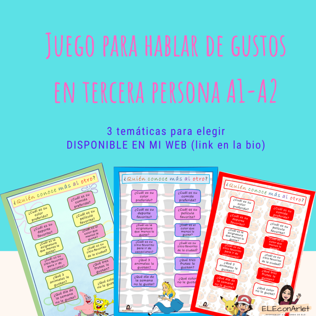 Os dejo este juego con tres temáticas, podéis combinarlas en clase o escoger la que más os guste. Está pensada para un nivel A1-A2 y consiste en repasar los gustos y las preferencias en tercera persona.