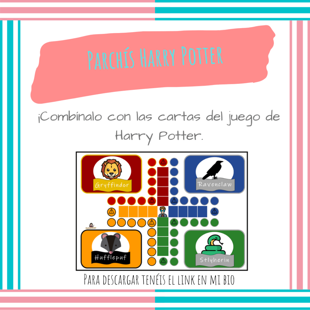 - Lo quiero todo hecho: Imprimes el tablero, imprimes las tarjetas de la entrada del juego Harry Potter y los divides en 4 grupos, cada vez que avanzan tienen que contestar una pregunta, si la respuesta es errónea no pueden avanzar. Pero, si caen en la casilla del triángulo no hace falta que contesten preguntas.