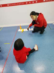 Este también es para la fonética. Preparas 3 flashcards y delante colocas 3 bolos, le dices a la niña ‘’letra A’’ y tiene que derribar el bolo que esté delante de la letra ‘’A’’. En clase siempre hay manos levantadas para participar.