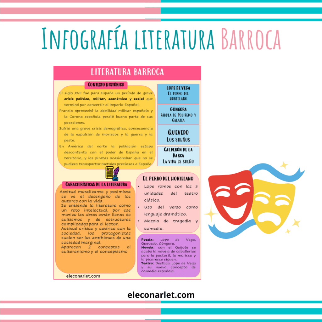 Sigo con mis clases de literatura, ya he terminado el temario del Barroco así que os dejo la infografía resumen. He decidido trabajar la obra de Lope »El Perro del Hortelano» porque me parece una de las obras más sencillas para mis estudiantes y, además es bastante divertida, por eso le he dedicado un mini apartado.