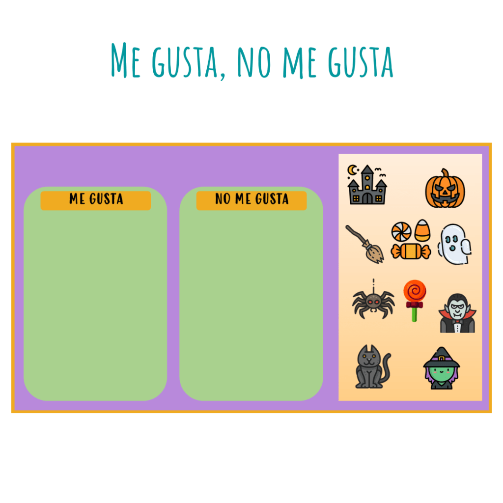1. Me gusta no me gusta: los estudiantes o el profesor tiene que ir moviendo los iconos dependiendo de los gustos de los estudiantes, tienen que hacer frases como: »me gustan los caramelos», »no me gusta la bruja»…