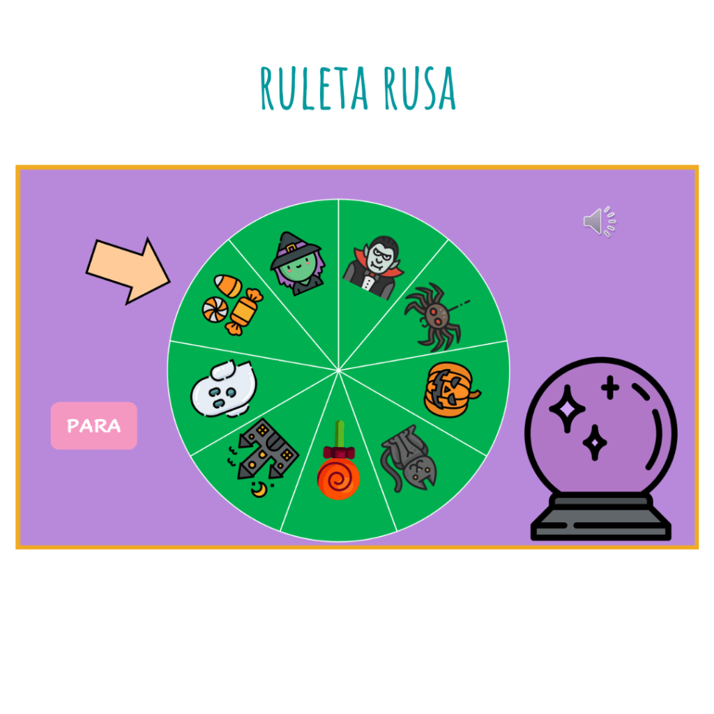 4. Ruleta rusa: Tienen que pensar qué creen que saldrá y decir el nombre. Por ejemplo: ¿qué piensas que saldrá?- el gato. (La ruleta para y es una bruja). ¿es un gato? -No. ¿qué es? – Es una bruja.