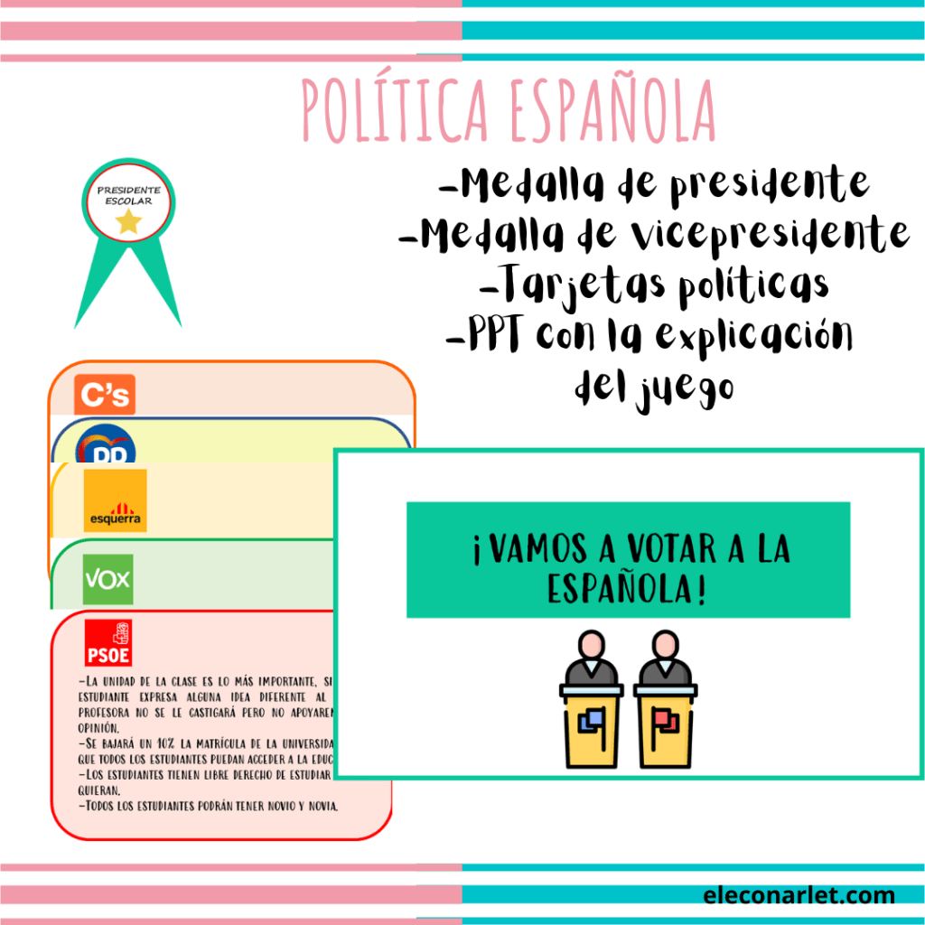 El juego consististe en que cada grupo de clase es un partido político y tienen que vender sus ideales para conseguir más votos que los demás partidos. Después de las votaciones tendrán que hacer pactos para conseguir la mayoría, los ganadores tendrán 2 estrellas: La de presidente y vicepresidente.