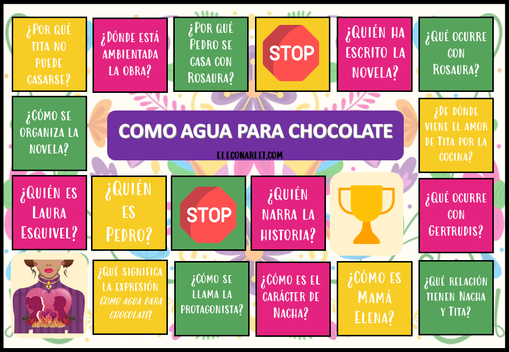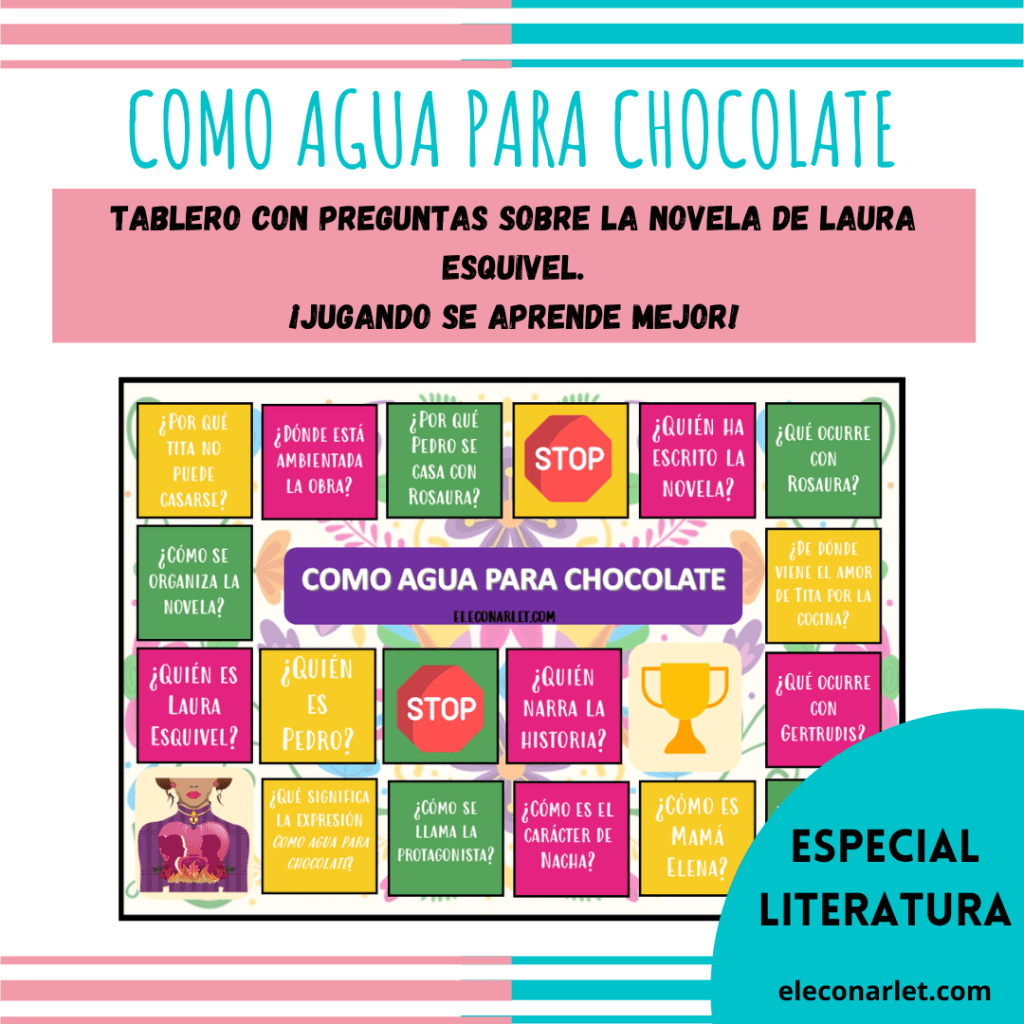 Lo prometido es deuda, por eso esta semana os traigo el tablero de de Como Agua para Chocolate. Me encanta hacer juegos para que las clases de literatura no sean tan »aburridas», estos juegos en los que tienen que manipular las fichas les encantan.